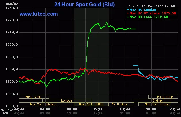 Vào lúc 5 giờ 35 phút sáng hôm nay 9/11 (giờ Việt Nam), giá vàng giao ngay thế giới niêm yết trên Kitco tăng 37,1 USD so với cùng giờ vào sáng hôm qua, neo ở mức 1.712,60 USD/ounce, quy đổi tương đương 51,340 triệu đồng/lượng.