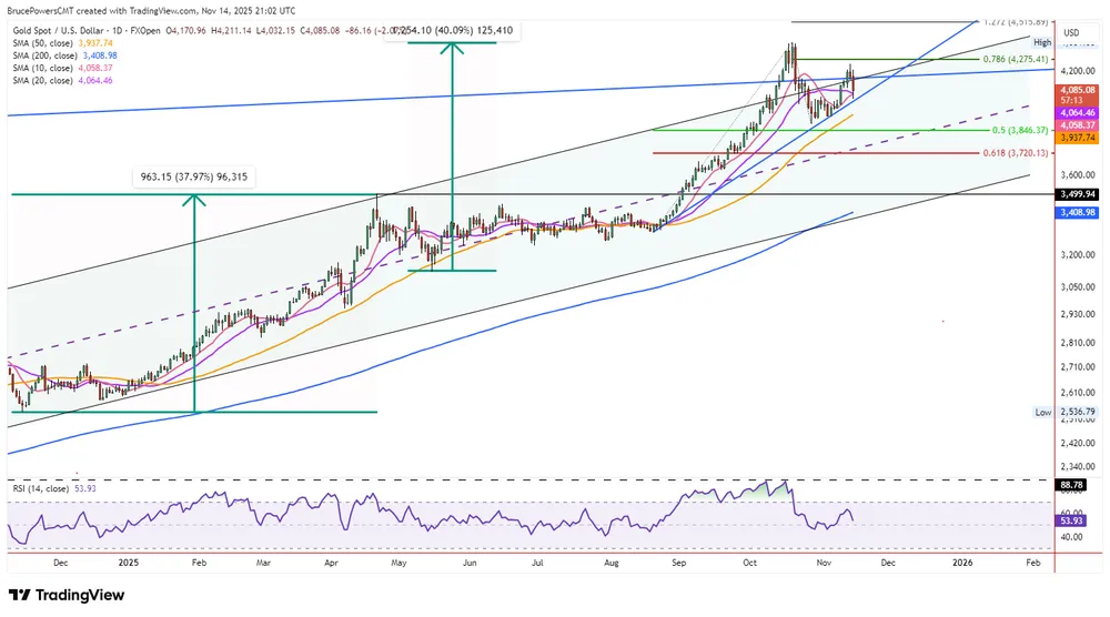 Theo chuyên gia Bruce Powers, nhịp giảm đầu phiên cho thấy vàng đang kiểm định lại đường xu hướng tăng bắt đầu từ các đáy cao gần đây. Việc đường này tiếp tục giữ vững cho thấy cấu trúc xu hướng tăng vẫn còn độ bền, đồng thời tạo tiền đề cho khả năng nối dài đà đi lên.