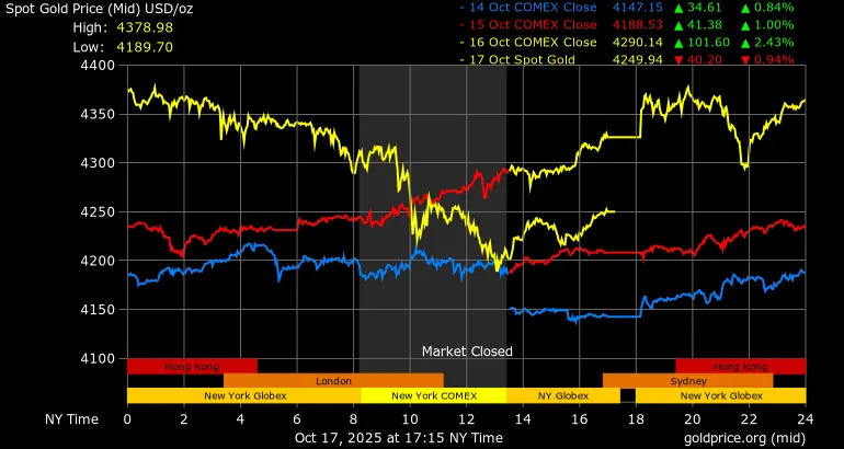 Tính đến thời điểm viết bài lúc 5 giờ 30 sáng 18-10 (giờ Việt Nam), vàng giao ngay được giao dịch ở mức 4.249,94 USD/ounce, giảm 0,94%.