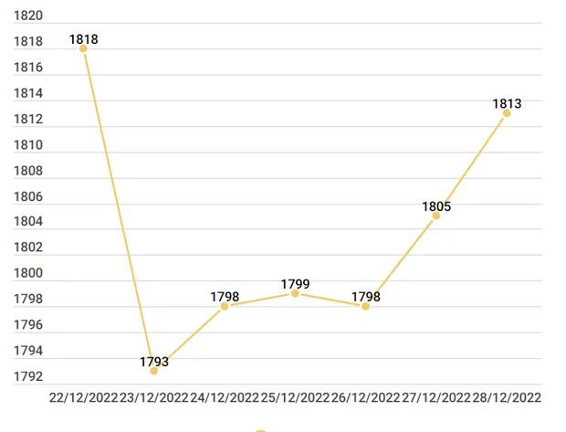 Diễn biến giá vàng thế giới giới từ 22/12-28/12. Đơn vị: USD