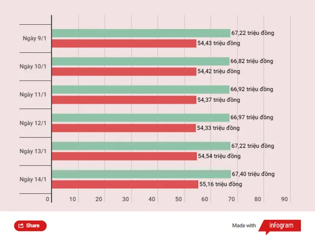 Nhìn lại tuần trước, với 4 phiên tăng giá và 2 phiên đi xuống. Tính chung cả tuần, thương hiệu SJC tăng khoảng 180.000 đồng mỗi lượng. Đáng chú ý, chênh lệch chiều mua và bán ra lên tới 1 triệu đồng/lượng.