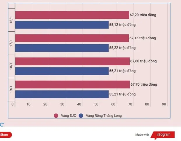 Dù thế giới đi xuống song giá vàng SJC trong nước vẫn bật tăng phiên mở cửa sáng nay (19/1). Theo đó, giá bán ra tại các doanh nghiệp đều chạm ngưỡng 67,7 triệu đồng/lượng.