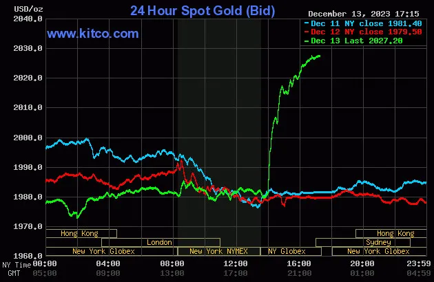 Vào lúc 5 giờ 15 phút sáng hôm nay 14/12 (giờ Việt Nam), giá vàng giao ngay thế giới niêm yết trên Kitco neo ở mức 2.027,20USD/ounce, quy đổi tương đương 60,311 triệu đồng/lượng.