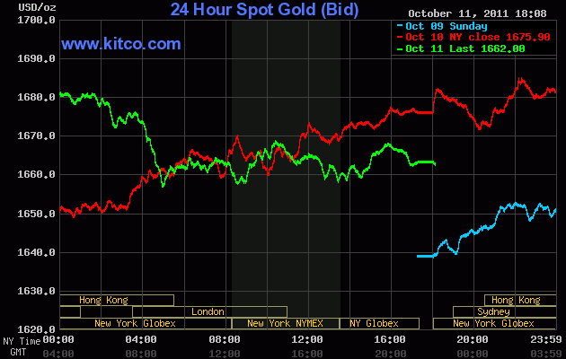 Đóng cửa ngày 11-10, giá vàng giao tháng 12 trên sàn Comex, New York giảm 9,8 USD tương đương 0,16% xuống 1.661 USD/oz. Trong khi phiên trước đó giá vàng kỳ hạn lên cao nhất hơn 2 tuần qua.