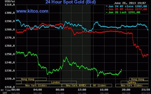 Trong vòng 4 phiên giao dịch kể từ khi FED phát tín hiệu về thu hẹp QE, giá vàng đã sụt khoảng 125 USD/oz. Hãng tin Reuters cũng cho biết, từ đầu quý 2 tới nay, giá vàng đã giảm 23%, trong khi chỉ còn 2 phiên giao dịch nữa là khép lại quý này. Như vậy, quý II-2013 rất có thể sẽ trở thành quý mất giá mạnh nhất của vàng kể từ khi Reuters bắt đầu theo dõi dữ liệu này vào năm 1968.