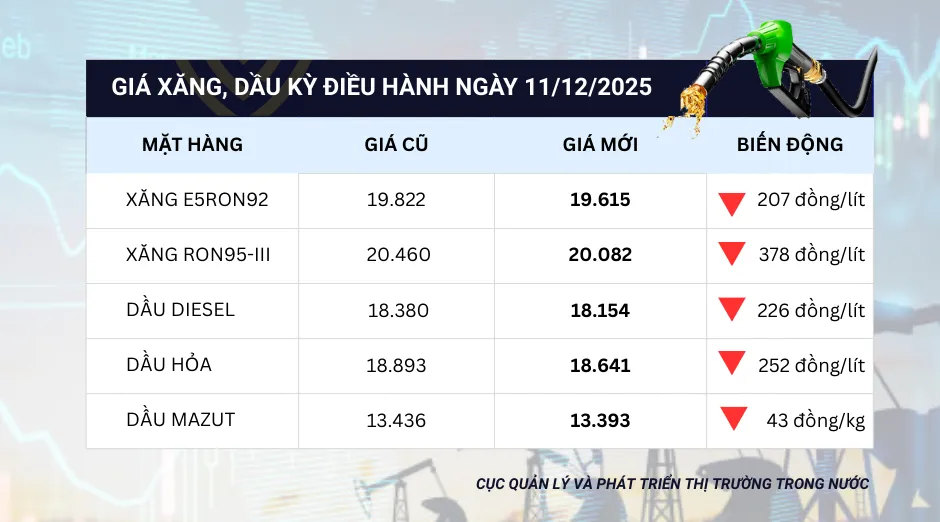 Trong lần điều chỉnh gần nhất vào ngày 4-12, giá xăng tăng, cụ thể xăng E5RON92 tăng 534 đồng/lít; xăng RON95-III tăng 451 đồng/lít. Trái ngược với xu hướng với giá xăng, giá dầu diesel giảm 420 đồng/lít; dầu hỏa giảm 580 đồng/lít; dầu mazut giảm 52 đồng/kg.