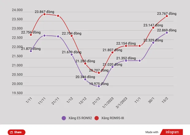 Trước đó, ngày 13/2, sau khi trích lập quỹ bình ổn, giá xăng RON95-III tăng 620 đồng mỗi lít, xăng E5 RON92 cộng thêm 540 đồng. Tuy vậy, dầu diesel giảm 962 đồng, dầu hoả giảm 982 đồng/lít và dầu mazut giảm 298 đồng/kg.