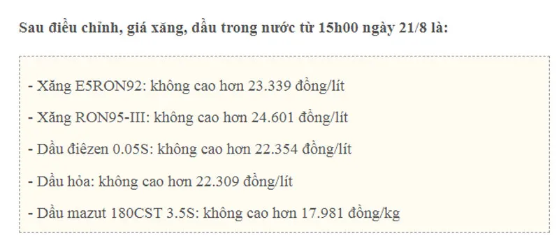 Theo đó, giá xăng E5 RON92 cộng thêm 517 đồng/lít, giá mới là 23.339 đồng/lít. Giá xăng RON95-III là 24.601 đồng/lít, tăng 608 đồng/lít. Cùng đó, giá dầu hỏa tăng 420 đồng lên mức 22.309 đồng/lít và dầu mazut tăng 313 đồng/kg, giá mới là 17.981 đồng.