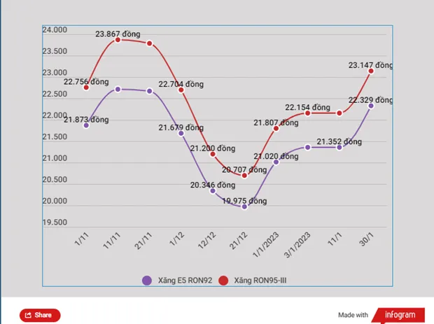 Trước đó, ngày 30/1, sau khi trích lập quỹ bình ổn, giá xăng RON95-III tăng 993 đồng mỗi lít, xăng E5 RON92 cộng thêm 977 đồng. Ngoài ra, dầu diesel tăng 890 đồng, dầu hoả tăng 767 đồng/lít và dầu mazut tăng 568 đồng/kg.