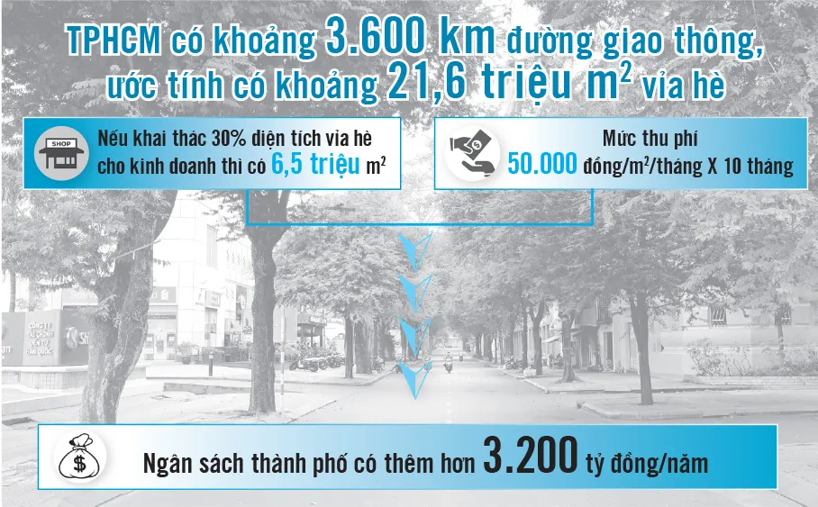 TS Dư Phước Tân (Viện Nghiên cứu phát triển TPHCM) tính toán, TPHCM hiện có khoảng 3.600km đường giao thông, ước có khoảng 21,6 triệu m² diện tích vỉa hè. Nếu chỉ sử dụng 30% diện tích vỉa hè, tức gần 6,5 triệu m², và thu phí 50.000 đồng/m²/tháng, thì TPHCM sẽ thu được hơn 3.200 tỷ đồng/năm (ước lượng thu trong 10 tháng). Với khoản thu lớn như vậy, TS Dư Phước Tân cho rằng, việc thành lập công ty hoặc trung tâm quản lý và khai thác quỹ vỉa hè đô thị là cần thiết. Ngoài việc quản lý, thu phí, đơn vị này còn có trách nhiệm thuê các chuyên gia nghiên cứu phát triển kinh doanh vỉa hè theo kinh nghiệm thế giới, để làm tăng thêm vẻ mỹ quan cho thành phố.