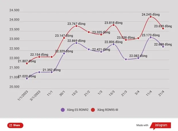 Trước đó, ngày 21/4, sau khi trích lập quỹ bình ổn, giá xăng RON95-III giảm 606 đồng mỗi lít; xăng E5 RON92 giảm 485 đồng/lít; dầu diesel giảm 752 đồng. Ngoài ra, dầu hỏa giảm 259 đồng/lít song dầu mazut tăng 649 đồng.