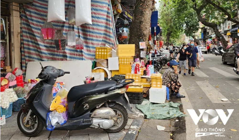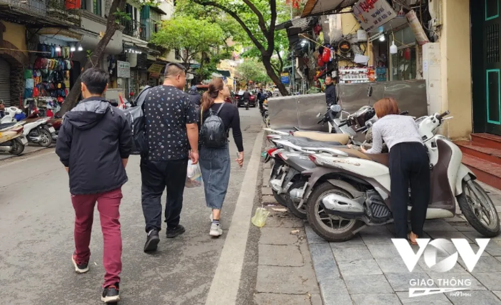 Tuy nhiên, tại nhiều tuyến phố cổ như phố Tô Tịch, Hàng Khoai, Hàng Giấy… vỉa hè vốn đã hẹp chưa đầy 1m nhưng xe cộ, hàng quán vẫn bày tràn lan, chiếm trọn vỉa hè và 1 phần lòng đường. Thậm chí xe ôtô còn án ngữ ngay trên vỉa hè, buộc người dân và du khách phải đi xuống lòng đường.