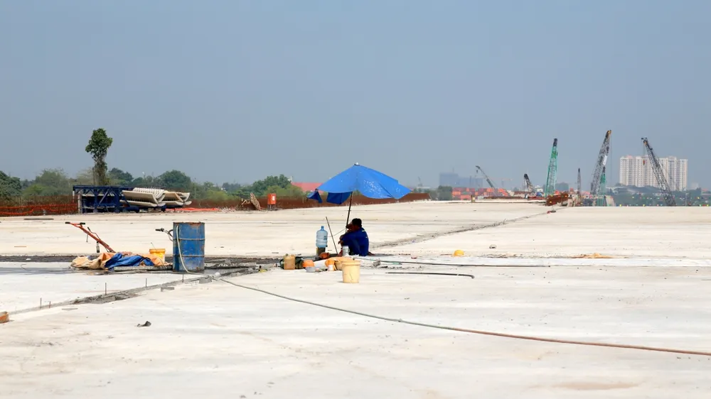 Giữa trưa, trong cái nắng gay gắt khá bất ngờ của thời điểm giáp Tết Nguyên đán, một đoạn công trường Vành đai 3 TPHCM khu vực phía Đông, đoạn sát với đường Nguyễn Xiển (địa bàn TP Thủ Đức cũ) thuộc gói thầu XL-05, các công nhân, kỹ sư tất bật đổ bê tông.
