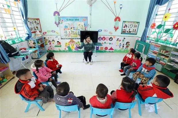 Một buổi học lớp ghép 2 + 3 + 4 tuổi của điểm trường Lũng Slàng thuộc trường Mầm non xã Tri Phương (Tràng Định, Lạng Sơn). (Ảnh: TTXVN phát)