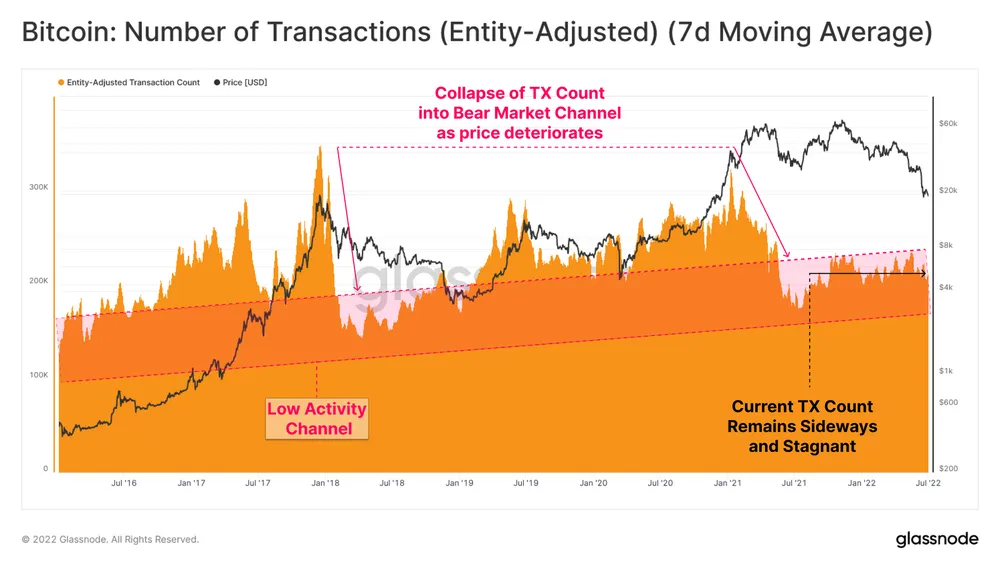 Hoạt động địa chỉ đã giảm từ hơn 1 triệu địa chỉ hoạt động hàng ngày vào tháng 11-2021 xuống còn khoảng 870.000 địa chỉ mỗi ngày trong tuần qua. Tương tự, các thực thể đang hoạt động, tập hợp nhiều địa chỉ thuộc sở hữu của cùng một cá nhân hoặc tổ chức, hiện có khoảng 244.000 mỗi ngày, Glassnode cho biết đây là “hoạt động thấp” điển hình của thị trường gấu.