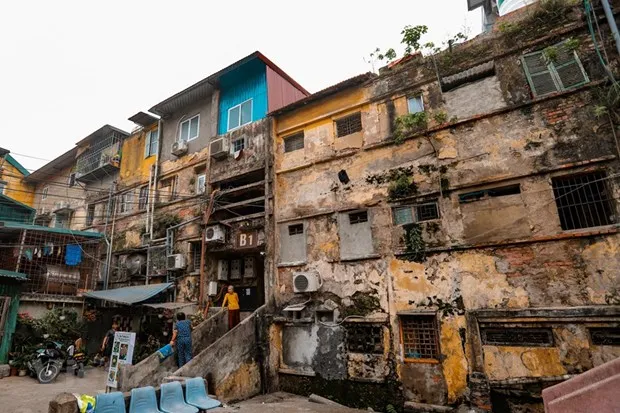 Khu tập thể trong ngõ Văn Chương (Đống Đa, Hà Nội) cũng trong tình trạng xuống cấp nghiêm trọng, từ mặt tiền tới bên trong đều bong tróc, rêu phong. (Ảnh: Hoài Nam/Vietnam+)