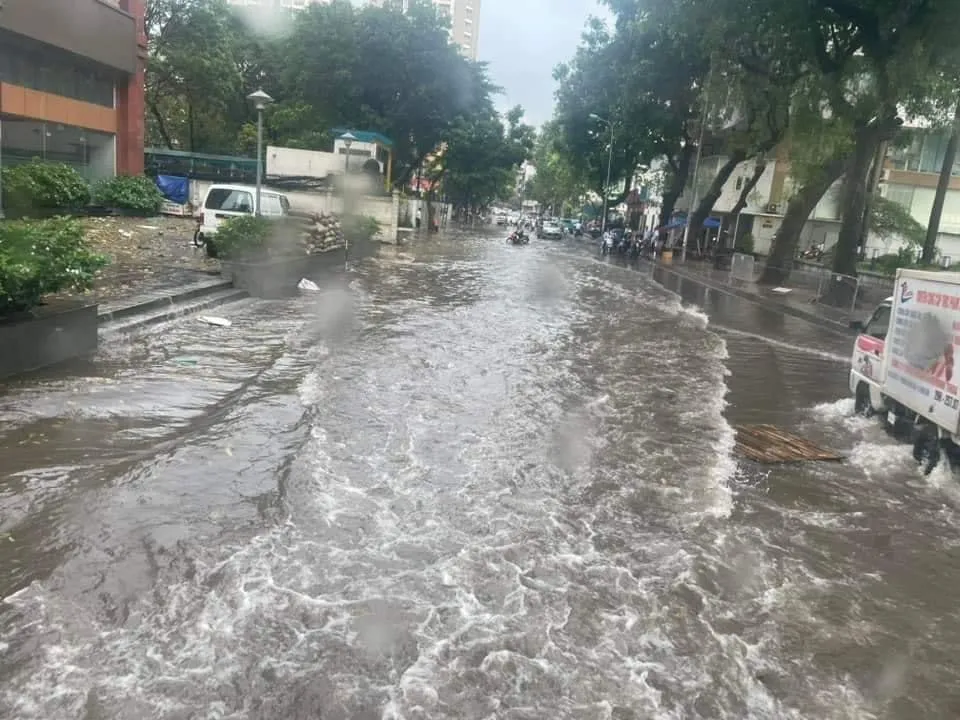 Cập nhật đến 9 giờ 30 sáng 16-9: Phố Lương Thế Vinh ngập như sông, nước ngập nửa bánh xe máy, tràn vào tận cổng KTX Mễ Trì Hà Nội. Ảnh: VĂN PHÚC