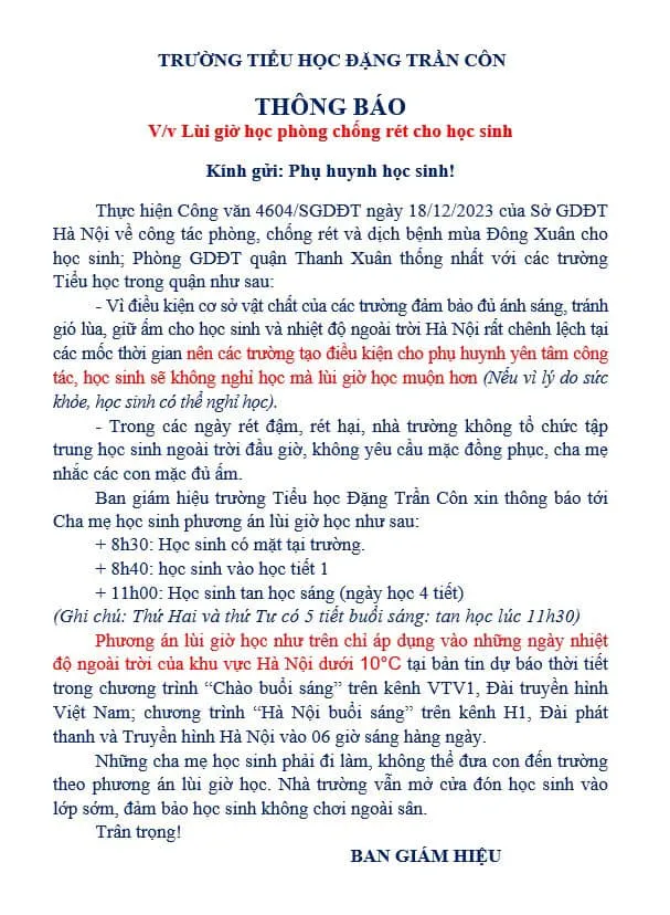 Theo quy định trên, các trường mầm non, tiểu học trên địa bàn Hà Nội được nghỉ học trong ngày 23-1. Do vậy, nhiều trường tiểu học đã có thông báo tới phụ huynh về việc cho con nghỉ học sau bản tin thời tiết lúc 6 giờ.