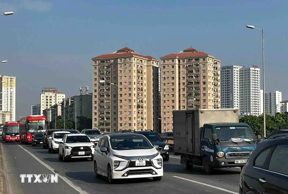 Từng hàng xe nối đuôi nhau di chuyển chậm lên đường Vành đai 3 trên cao hướng ra khỏi trung tâm Thủ đô. (Ảnh: Phạm Kiên/TTXVN)