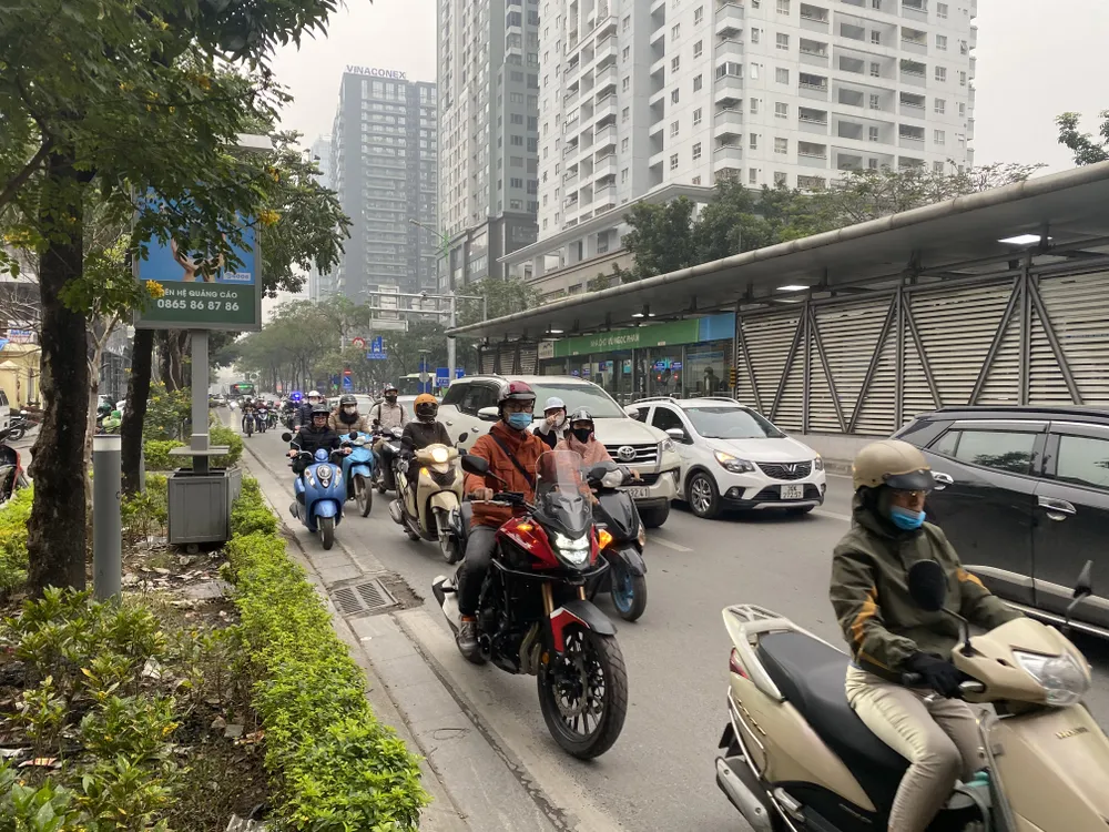 Trên đường Thái Hà, nhiều xe máy len lỏi giữa “rừng” ô tô cá nhân, thậm chí xe máy phải leo vỉa hè để di chuyển.