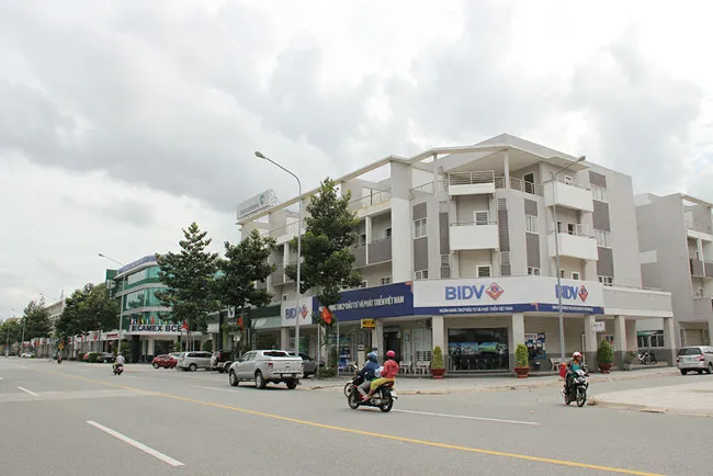 Một dãy phố kinh doanh nhộn nhịp tại thành phố mới Bình Dương. Để phục vụ đông đảo doanh nghiệp và người dân, hiện nay rất nhiều ngân hàng lớn như BIDV, Vietcombank, Agribank, Vietinbank, Sacombank, ACB, HDBank… đều đã mở chi nhánh tại thành phố mới Bình Dương và khu vực lân cận.