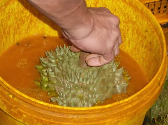 Chúng tôi trở ra khu Thái Bình Dương, gặp ông chủ dễ tính cho đứng xem, nhưng cấm quay phim. Khoảng 10 công nhân đang làm việc, họ phải đeo găng tay, bịt kín từ đầu đến chân để tránh... ngộ độc hóa chất. Những quả sầu riêng xanh được công nhân nhúng vào thùng dung dịch loại 30 lít, bên trong có hóa chất đặc quánh, vàng như nghệ. Nhúng xong họ đem xếp cho ráo nước, ngấm thuốc rồi cho vào thùng lên những chiếc container.