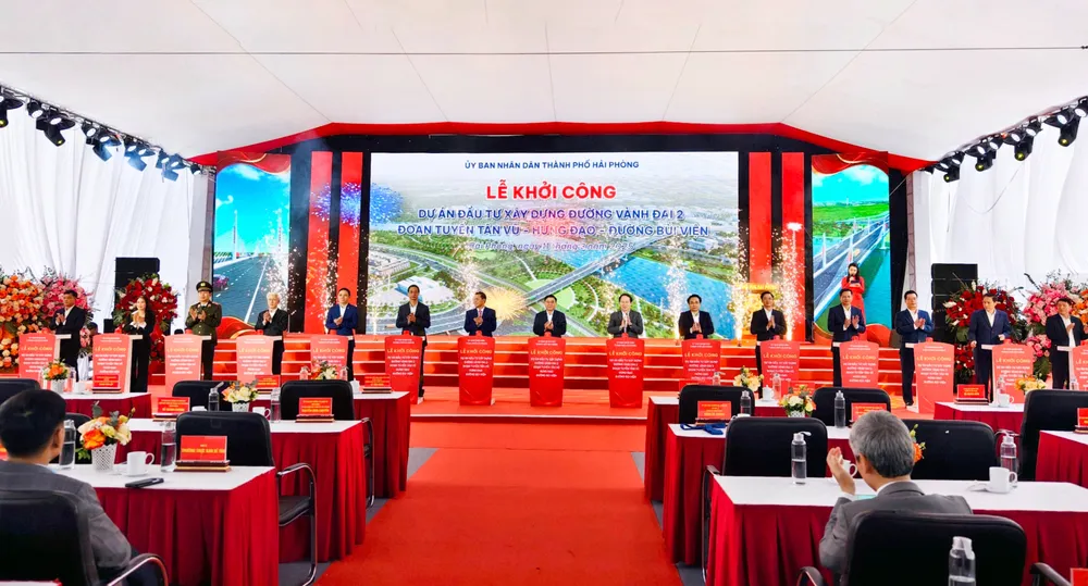 Ông Trần Cẩm Tú cùng lãnh đạo TP Hải Phòng bấm nút khởi công Dự án Đầu tư xây dựng đường Vành đai 2 đoạn tuyến Tân Vũ - Hưng Đạo - đường Bùi Viện