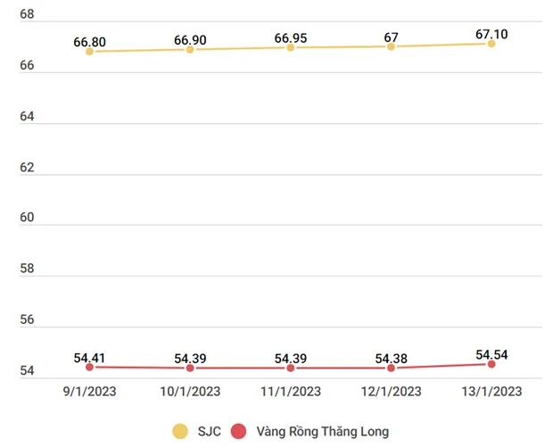Diễn biến giá vàng SJC và vàng Rồng Thăng Long trong tuần. Đơn vị: Đồng