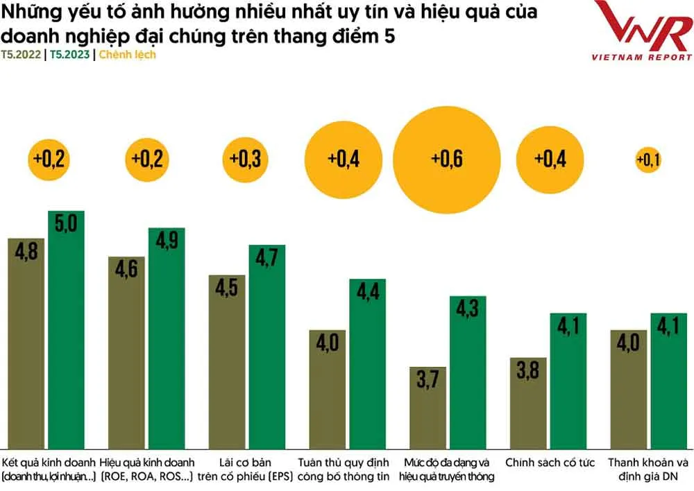 Kết quả khảo sát chuyên gia và doanh nghiệp đại chúng của Vietnam Report còn chỉ ra rằng các yếu tố liên quan đến công tác truyền thông ghi nhận gia tăng tác động lớn nhất đến mức độ uy tín và hiệu quả của doanh nghiệp. Giới chuyên gia cũng cho rằng nhà đầu tư hiện đặt mối quan tâm về minh bạch thông tin lên hàng đầu.