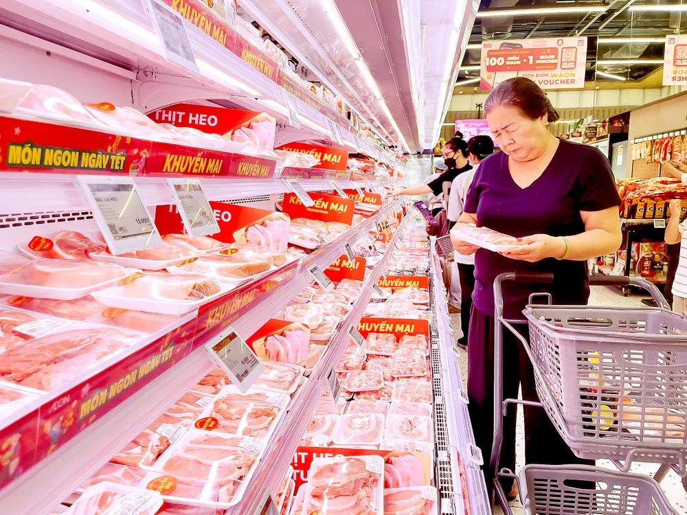 Quầy thịt heo phục vụ khách hàng tại siêu thị AEON Parc Mall, phường Chánh Hưng, TPHCM. Ảnh: HOÀNG HÙNG