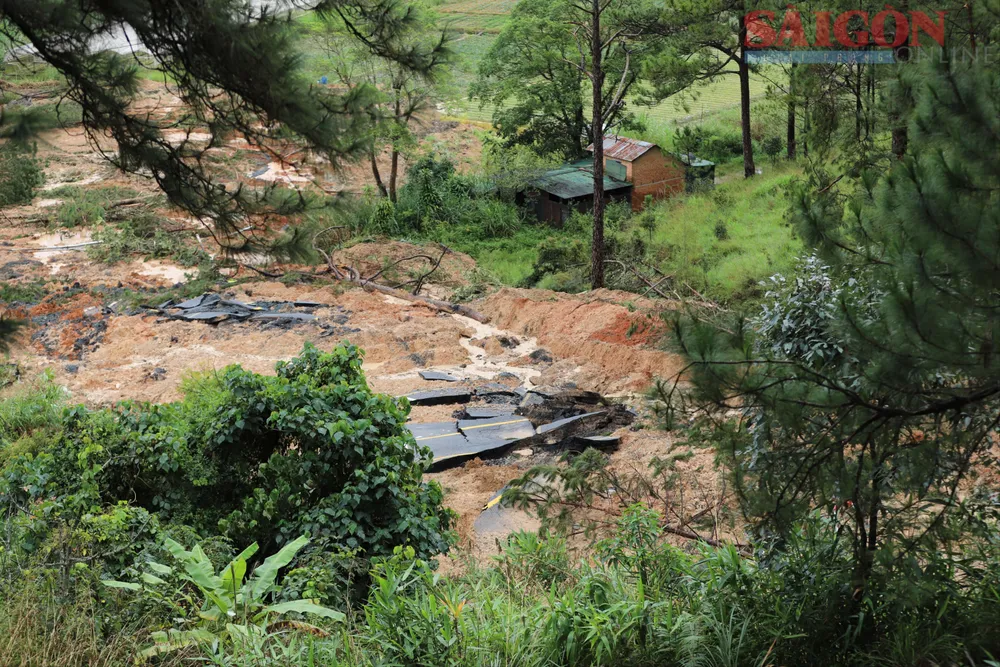 Mặt đường nhựa, cây xanh bị kéo trôi xa hàng trăm mét xuống phía dưới sườn đồi
