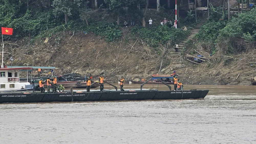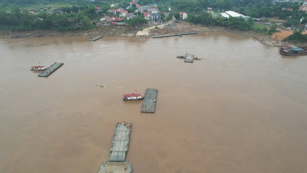 Sáng nay, trên sông Hồng tại vị trí bắc cầu có chiều rộng gần 190m, lưu tốc dòng chảy khoảng 1,1m/giây, độ sâu trên 12m.
