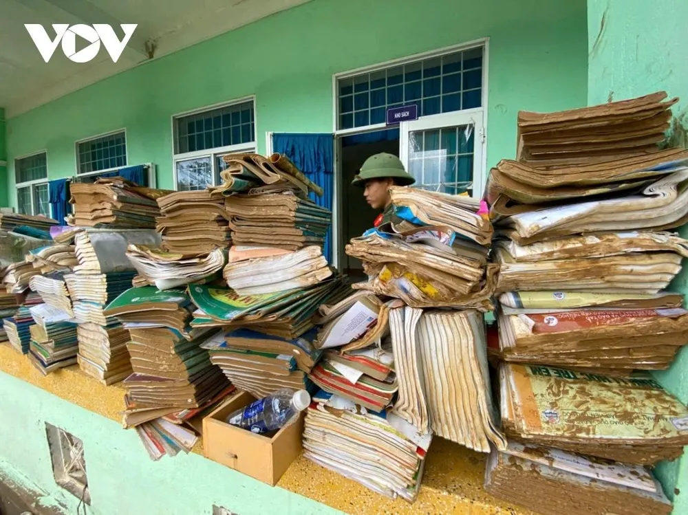 Sách vở học sinh thấm bùn đất vì nước lũ.