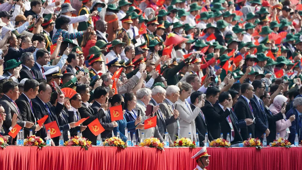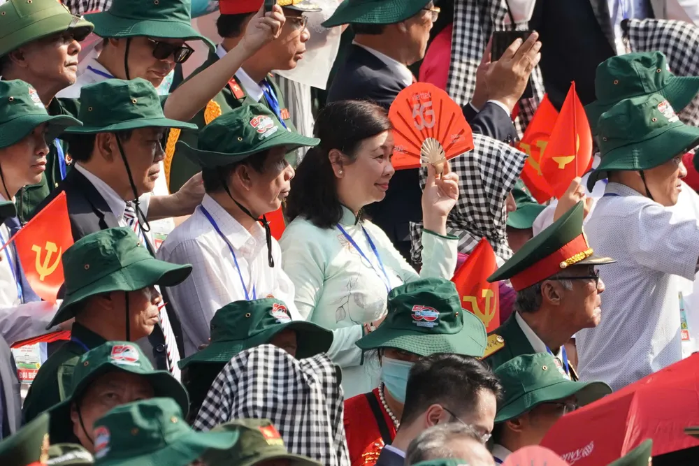 Đại biểu theo dõi diễu binh, diễu hành Lễ kỷ niệm 50 năm Ngày Giải phóng miền Nam, thống nhất đất nước