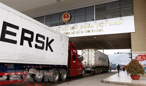 Các xe container chở hàng nông sản chờ làm thủ tục xuất khẩu sang Trung Quốc tại Cửa khẩu quốc tế đường bộ số II Kim Thành. (Ảnh: TTXVN)