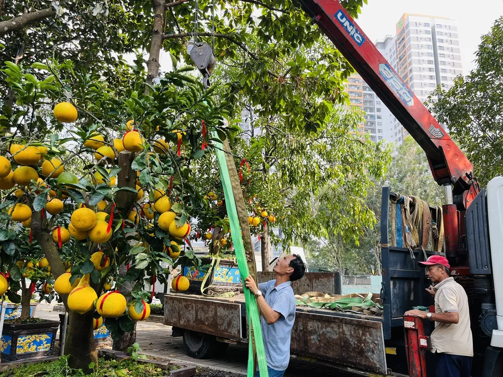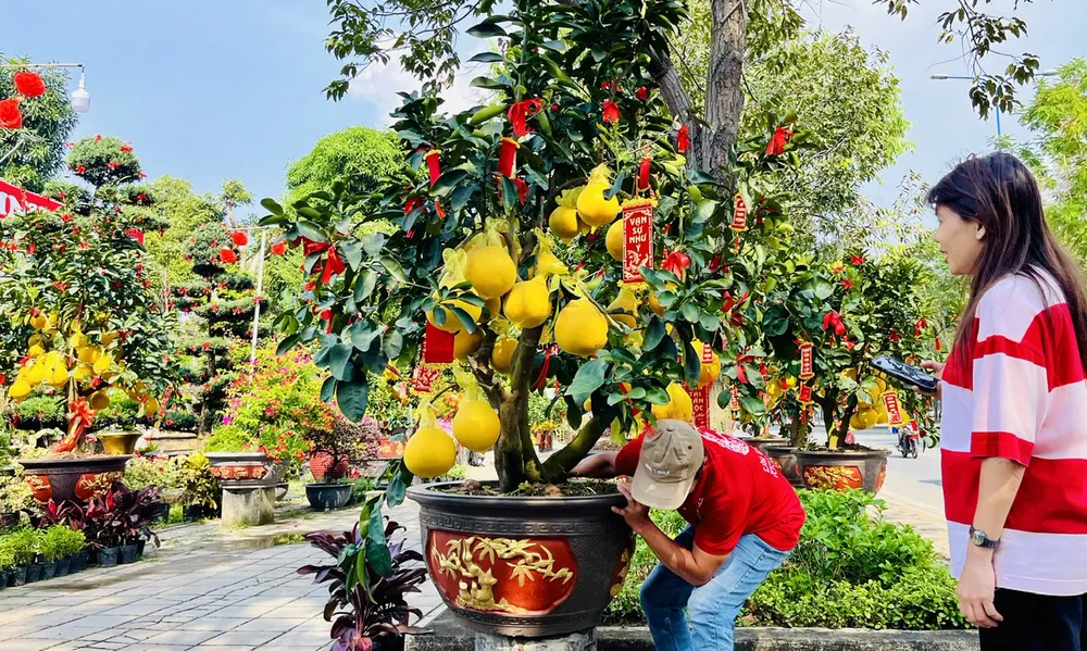 Các chậu bưởi lớn từ các tỉnh phía Bắc được nhà vườn đưa về TPHCM sẵn sàng phục vụ khách. Ảnh chụp chiều 18-1 trên đường Mai Chí Thọ, TP Thủ Đức. Ảnh: THI HỒNG