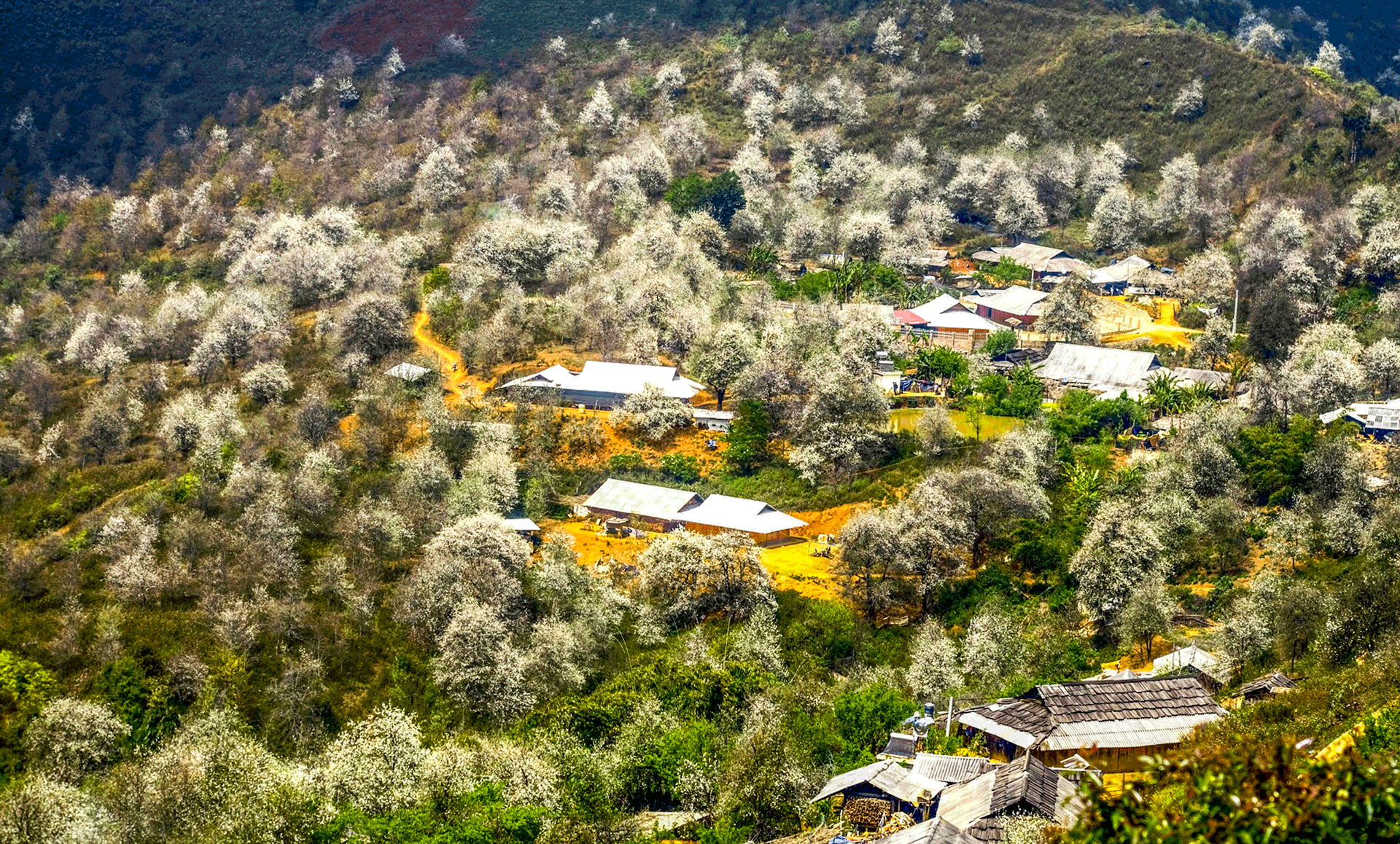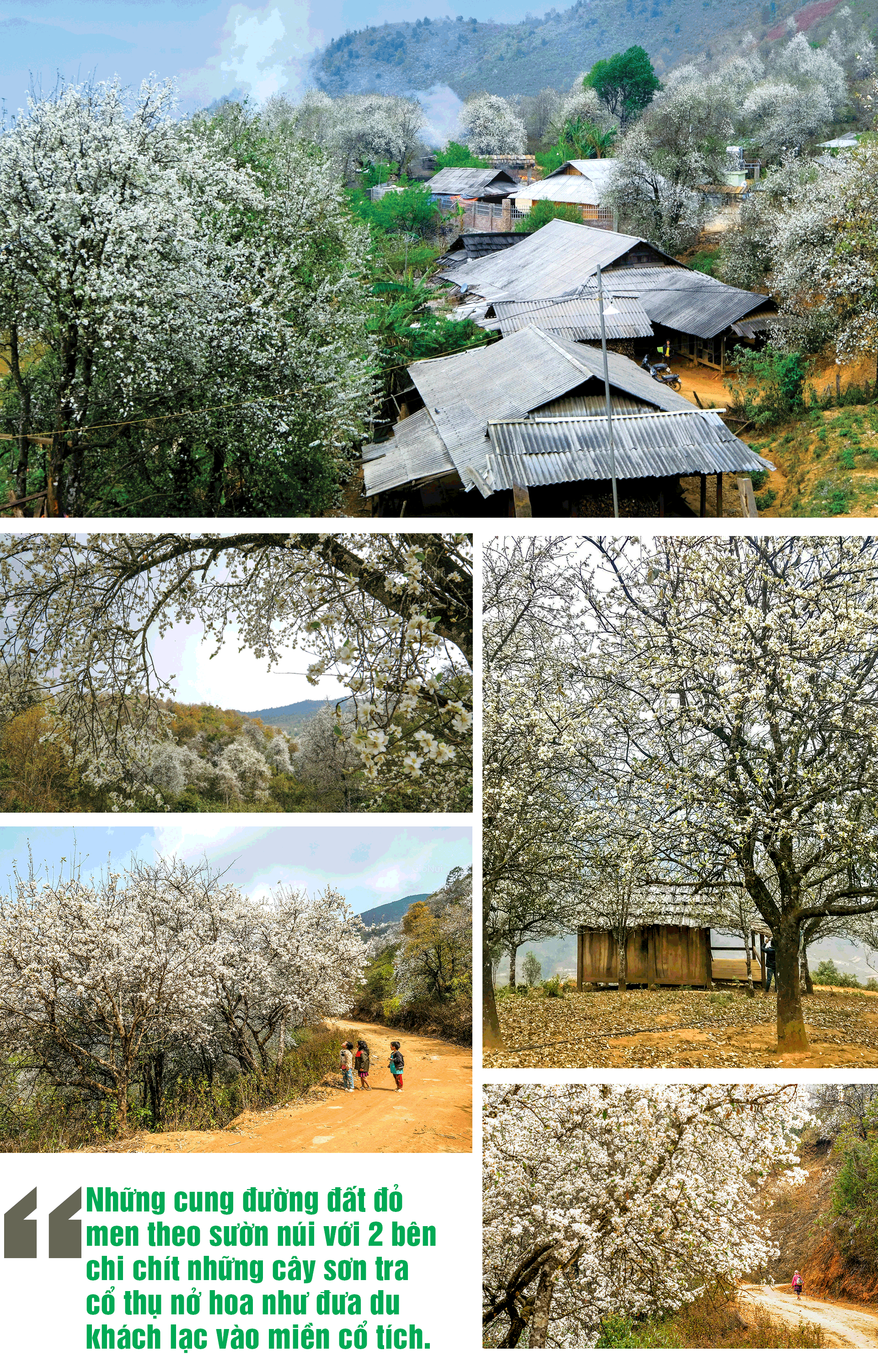 Cả một vạt núi bao la chạy đến tận chân trời chỉ toàn cây sơn tra đang bung nở khoe sắc với đất trời. Những cung đường đất đỏ men theo sườn núi với 2 bên chi chít những cây sơn tra cổ thụ nở hoa như đưa du khách lạc vào miền cổ tích. Mùi thơm nhè nhẹ nhưng không kém phần quyến rũ, ấn tượng của loài hoa sơn tra càng làm cho du khách bồi hồi, xao xuyến.