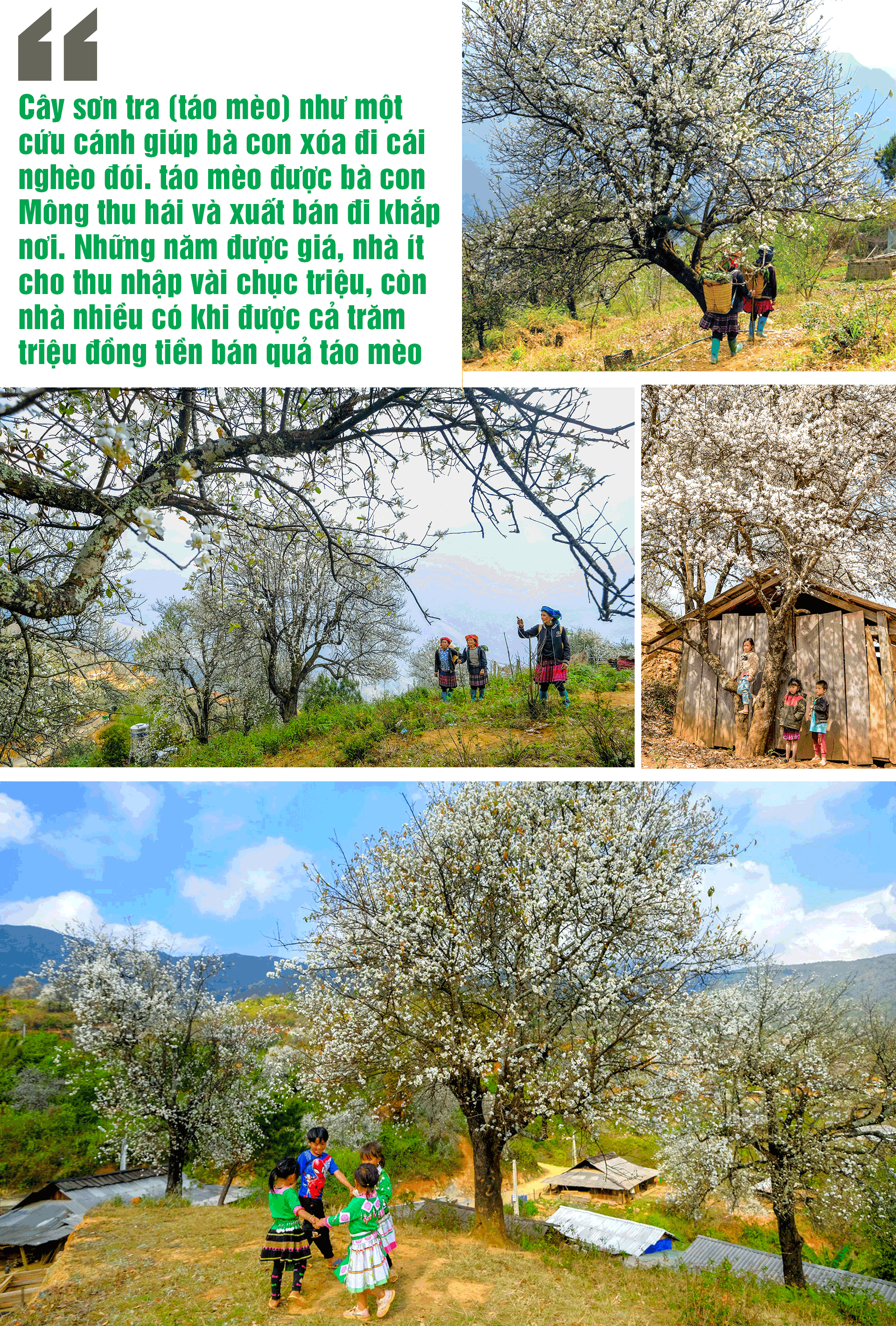 Trên những mỏm núi cao chót vót ngỡ như chạm đến mây trời, chúng tôi được ngắm vài nếp nhà gỗ đơn sơ của người Mông ẩn hiện trong rừng hoa sơn tra trắng xóa. Những đóa hoa sơn tra đung đưa trong gió xuân, tô điểm thêm cho núi rừng, bản làng một vẻ đẹp huyền ảo.