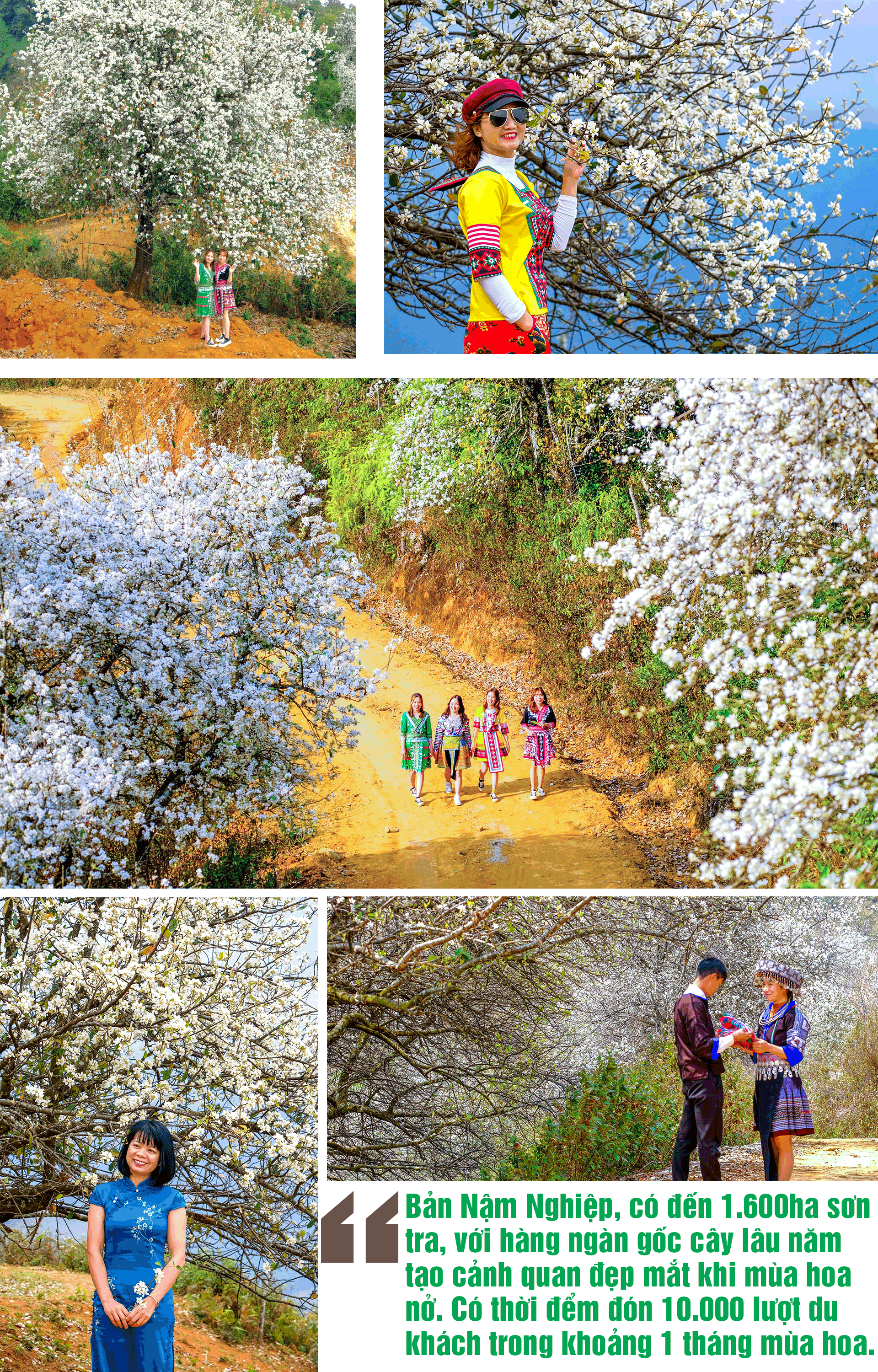Trên những con đường đất đỏ dọc ngang bản Nậm Nghiệp, thỉnh thoảng mọi người bắt gặp các cô gái Mông vận bộ trang phục thổ cẩm truyền thống lên nương, đi chơi… giữa mùa hoa sơn tra trắng.