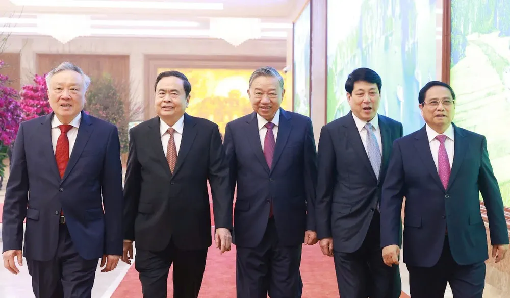 Tổng Bí thư Tô Lâm, Chủ tịch nước Lương Cường, Thủ tướng Phạm Minh Chính, Chủ tịch Quốc hội Trần Thanh Mẫn tới dự hội nghị tổng kết công tác năm 2024 và triển khai nhiệm vụ năm 2025 của Chính phủ và chính quyền địa phương, sáng 8-1. Ảnh: VIẾT CHUNG