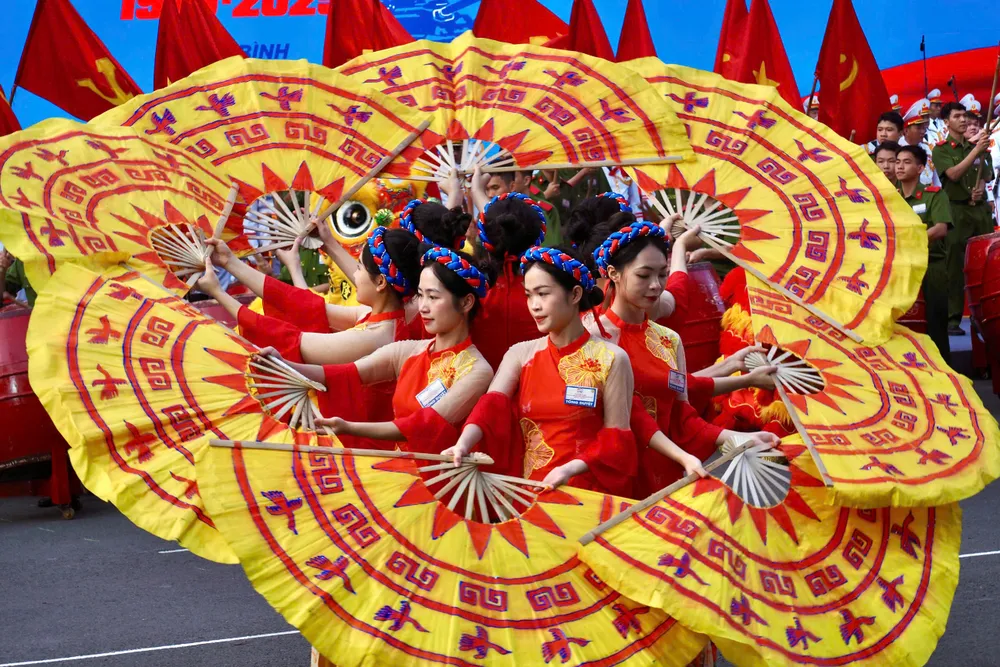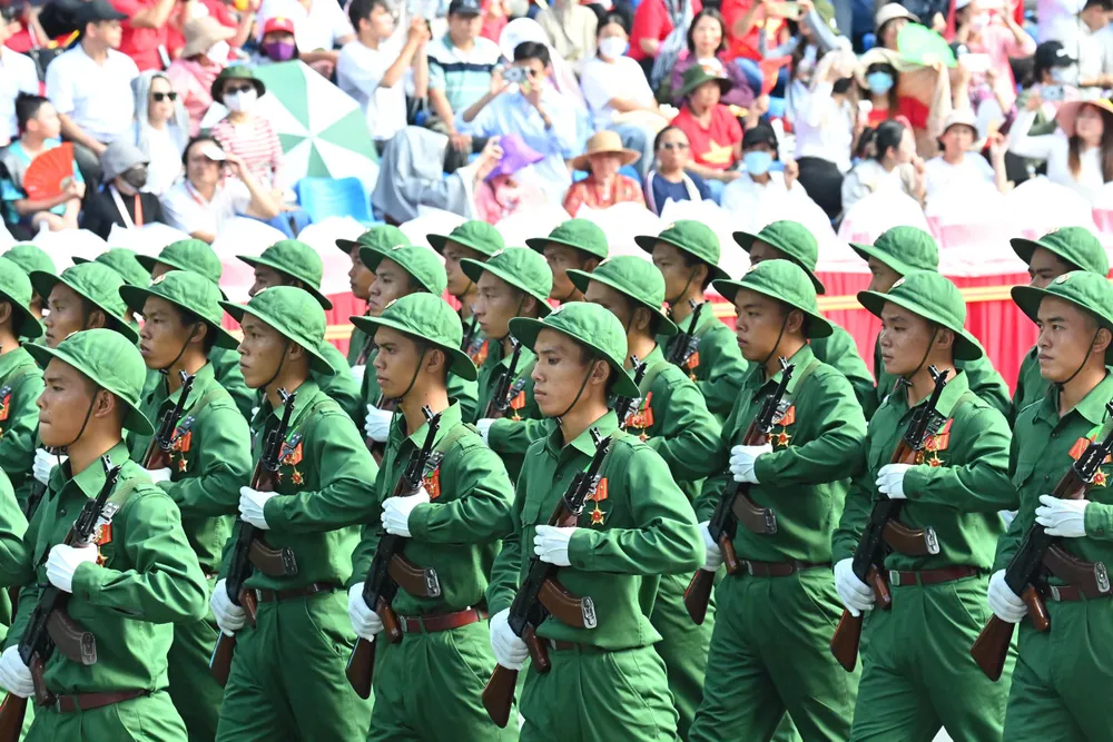 Tiếp nối là lực lượng dân quân tự vệ với các đội hình: khối nam dân quân biển, khối nữ du kích miền Nam và khối nữ dân quân miền Bắc.