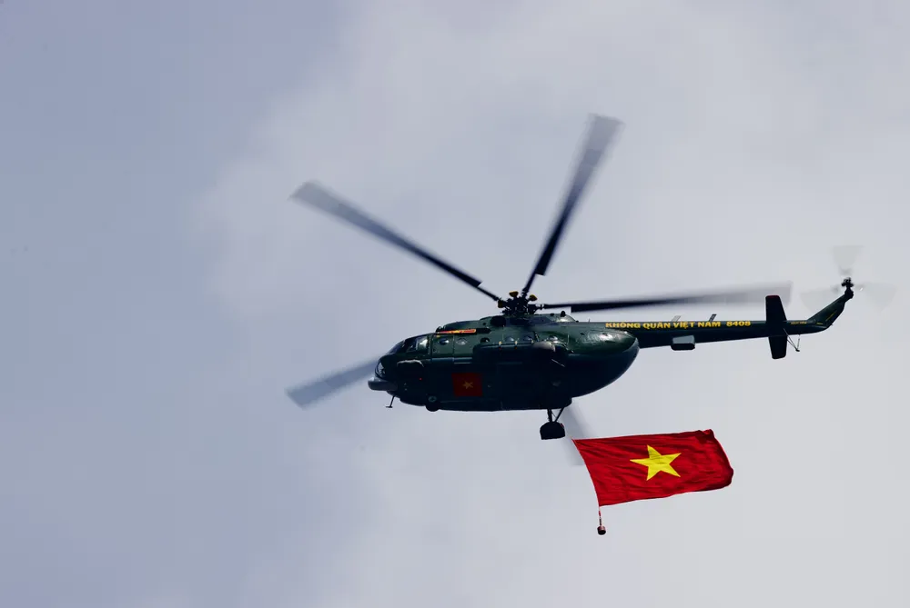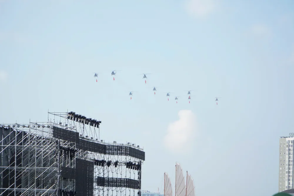 Các biên đội trực thăng bay sáng nay gồm 10 chiếc, bay theo đội hình 3-4-3. Các trực thăng đều treo cờ Đảng, cờ Tổ quốc và bay 2 vòng trên khu vực diễn ra buổi tổng duyệt.