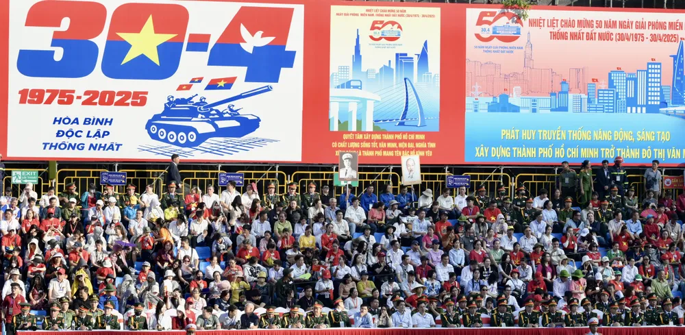 Phía dưới, khu vực Bến Bạch Đằng, sau khi dàn đại bác khai hỏa, dù trời khá nóng nhưng “biển” người vẫn nán lại để xem dàn máy bay chiến đấu bay lượn trên bầu trời thành phố. Nhiều người dùng điện thoại để ghi lại khoảnh khắc máy bay bay qua cùng những tiếng trầm trồ thán phục.