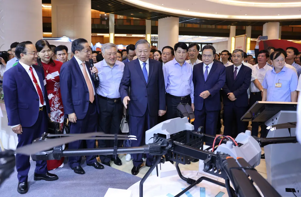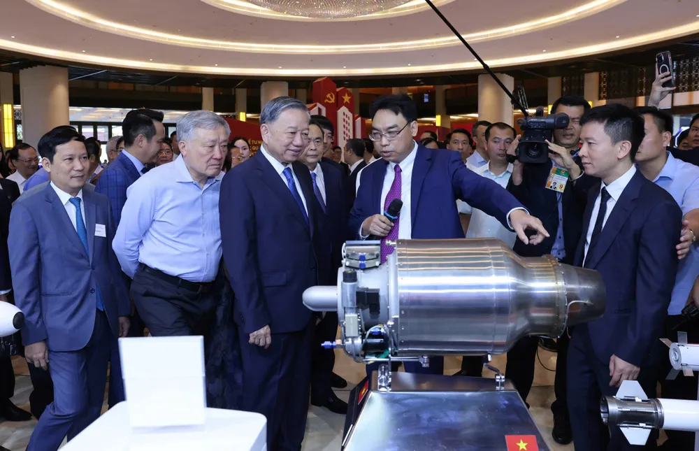 Tổng Bí thư Tô Lâm và các đại biểu tham quan và nghe giới thiệu về triển lãm. Ảnh: QUANG PHÚC