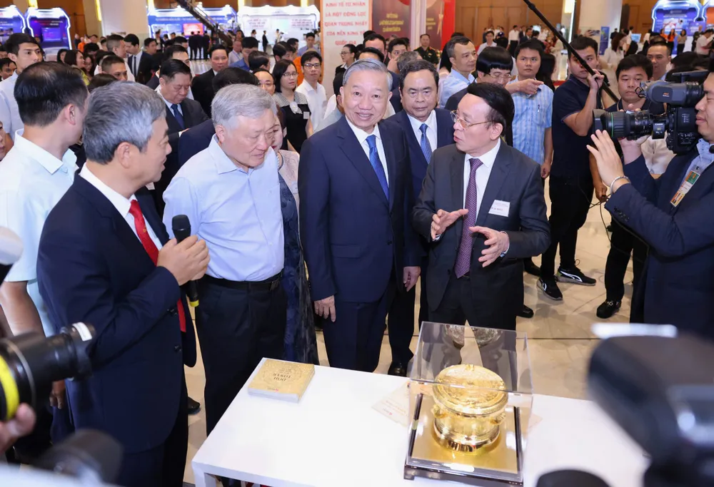 Trước giờ khai mạc hội nghị, tại Nhà Quốc hội, Tổng Bí thư Tô Lâm và các đại biểu đã tham quan và nghe giới thiệu về triển lãm “Những thành tựu trong xây dựng và thực thi pháp luật” và “Những thành tựu trong phát triển kinh tế tư nhân”.