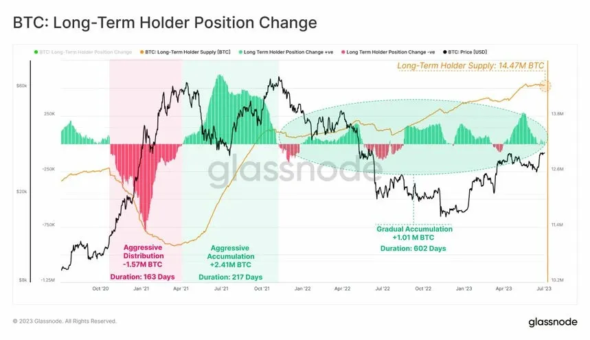 Số liệu của Glassnode cho thấy các nhà đầu tư BTC sẵn sàng nắm giữ tài sản này trong thời gian dài đã mua lượng đáng kể từ tháng 4 đến đầu tháng 7-2023. Vua coin hoạt động khá tốt trong những tháng đó, vì gần đây nó đã đóng quý thứ hai liên tiếp trong sắc xanh lần đầu tiên kể từ năm 2021.