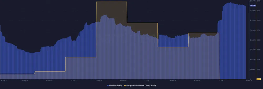 Bất chấp tâm lý suy giảm, BNB vẫn đạt được khối lượng hàng tuần cao nhất trong 24 giờ qua. Điều này có thể giải thích tại sao giá tiếp tục tăng, mặc dù sự thiếu nhiệt tình cho thấy phe bò BNB đang rút lui. Nó dường như phản ánh FUD và mối lo ngại xung quanh những tai ương mới nhất của Binance.