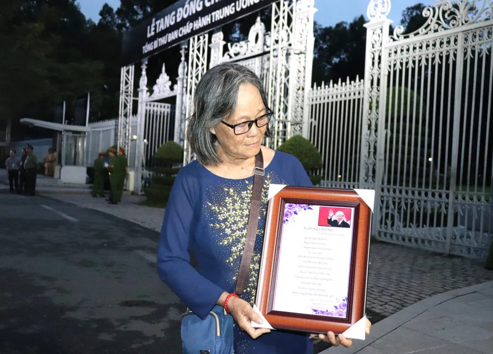 Ôm trên tay khung ảnh có hình Tổng Bí thư Nguyễn Phú Trọng cùng bài thơ do mình sáng tác, bà Nguyễn Thị Tuyết (66 tuổi, ngụ TP Bến Cát, tỉnh Bình Dương) cho biết, bà xuất phát từ 3 giờ 30 sáng nay và có mặt tại Hội trường Thống Nhất lúc 5 giờ sáng.