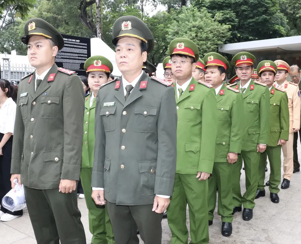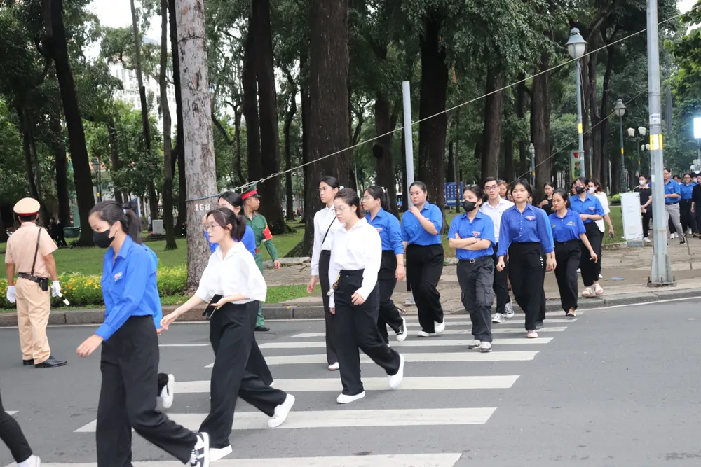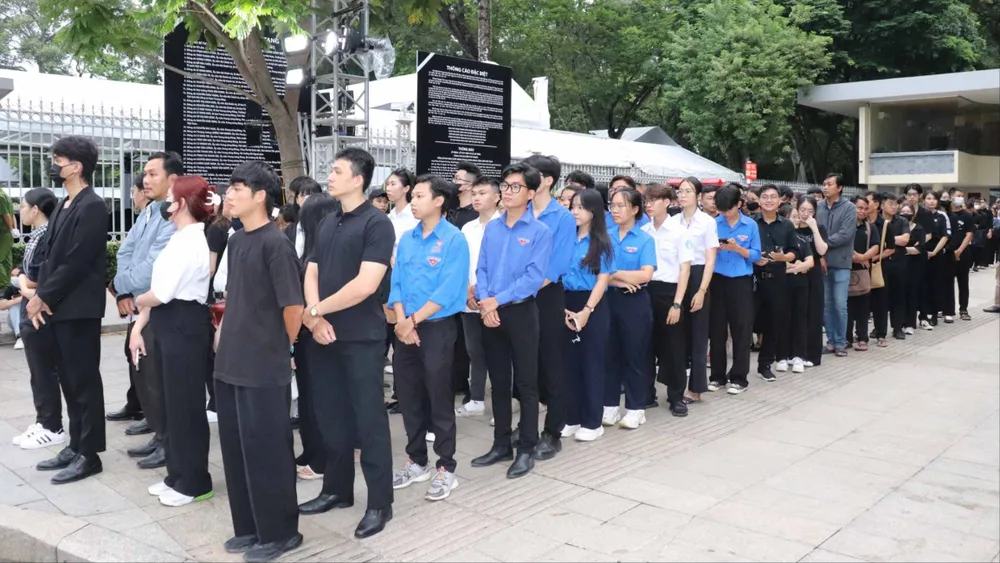 Từ sáng sớm, các đoàn cũng đến xếp hàng chờ vào viếng Tổng Bí thư Nguyễn Phú Trọng tại Hội trường Thống Nhất
