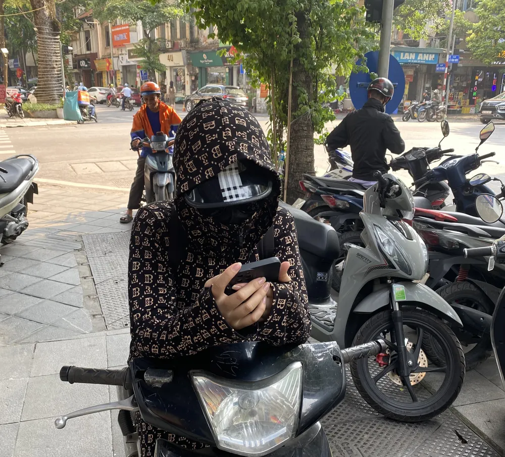 Một cô gái Hà Nội bịt khăn kín mít để chống nắng nóng khi đi ra đường. Ảnh: VĂN PHÚC